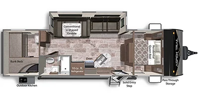 This unit is going to rent out very fast this year – It’s brand new to our fleet.  This Aspen Model 2910 BH has a spacious living area with a u-shaped dinette for all those large group meals.  Queen Master bedroom with double bunks for comfortable sleeping.