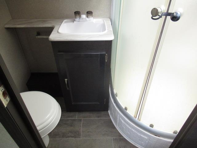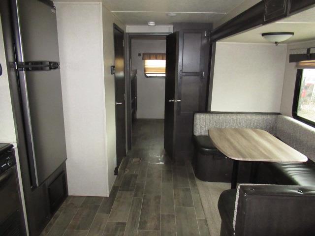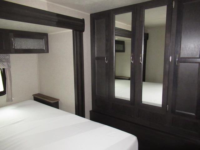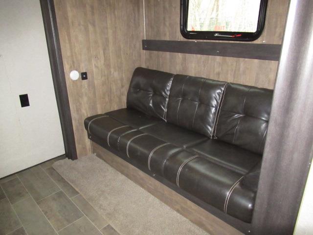 This rear bunk travel trailer provides great space for you and all of your family. With three slides, all on one side of the unit, it will grant you and the guests room everywhere you go. The L shaped countertop in the kitchen gives you the ability to entertain without feeling cramped. The front bedroom has a slide out containing a bed, along with a deep closet. Furthermore, you are provided with a great deal of natural light through out with windows in every room.