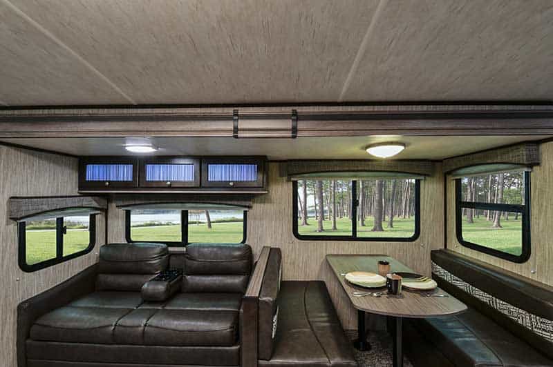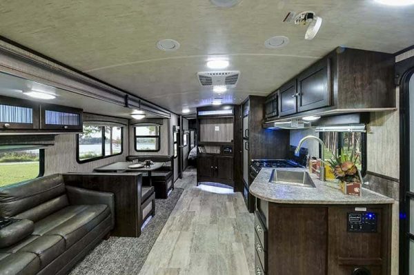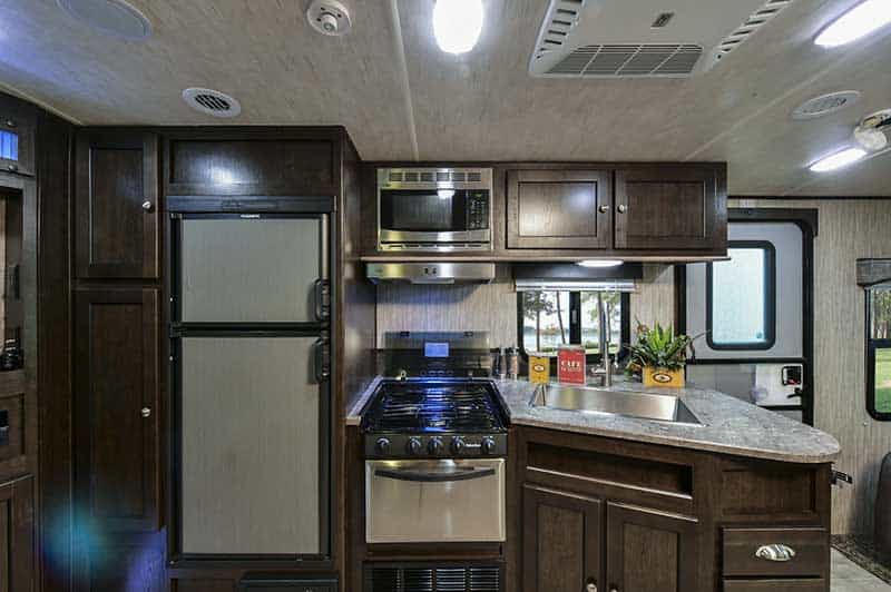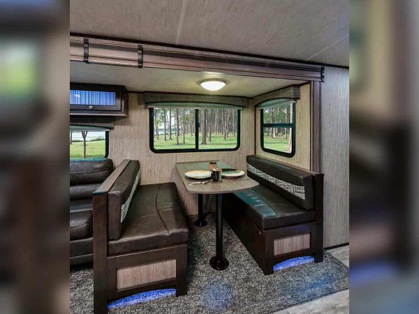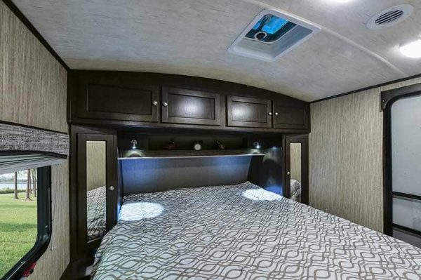 Imagine you and your spouse relaxing inside this travel trailer after fishing at the lake, kayaking down a river, or shopping at the local stores. You might enjoy the dual entry feature the most when you decide to sneak out the main entry to catch a fish early in the morning so you don’t wake up your spouse. The front bedroom offers a comfortable queen bed, plus wardrobes and overhead storage for all your clothing and things. Now imagine making meals together in the galley kitchen and relaxing on the chairs or sofa while talking about the day. You can dine and play games at the dinette when you aren’t relaxing outside under the awning. Take a look today!