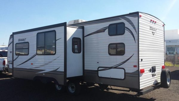 With its spacious floorplan including a large slide-out, full kitchen and bathroom, large bunks in the back, and private queen bed up front, this unit will sleep 6-7 -enough room for your whole family and a couple of guests as well! The indoor entertainment system and outdoor patio awning make for entertainment no matter the weather, while the propane furnace and air conditioning ensure optimal comfort. Don’t wait to book, dates are filling up fast!