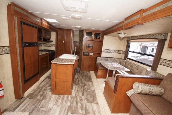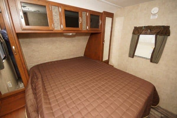 Complete with all the amenities, this unit features a roomy layout that sleeps up to 8 with a private queen bed, rear bunk room, full ISLAND kitchen and bathroom, and three large electric slide-out for even more space. Whether you choose to put the entertainment system and air conditioning to use indoors, or recline under the patio awning outdoors, we are sure you will love this high-end trailer rental for all of your adventures. As an added bonus, there is a small outside refrigerator for your favorite drinks for easy access.