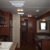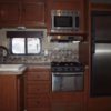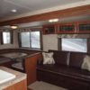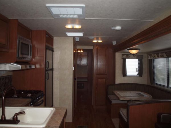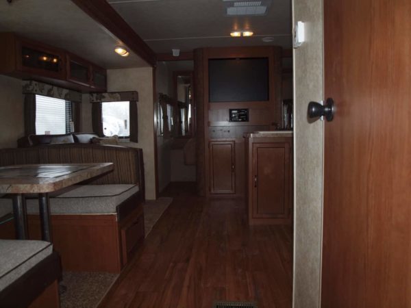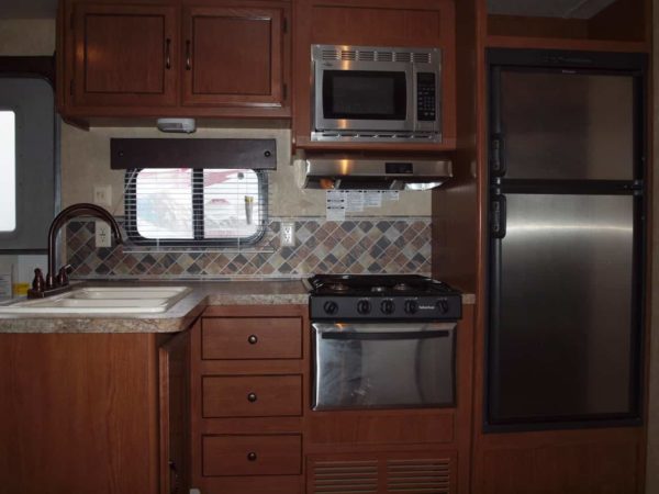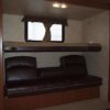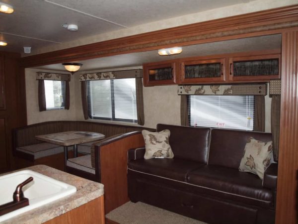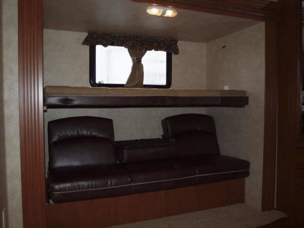 With sleeping for up to 8, a full kitchen and bathroom, and three large electric slide-outs, this rental will house your whole family and a few guests as well. The propane furnace and air conditioning ensure optimal comfort, while the entertainment system and electric patio awning provide entertainment no matter the weather. In case of rain, you’ll have the luxury of having 6’ of open floor space in between bunks. You also have the option of another leather sofa with cup holders and a TV at the rear of the trailer. Options, options, options.